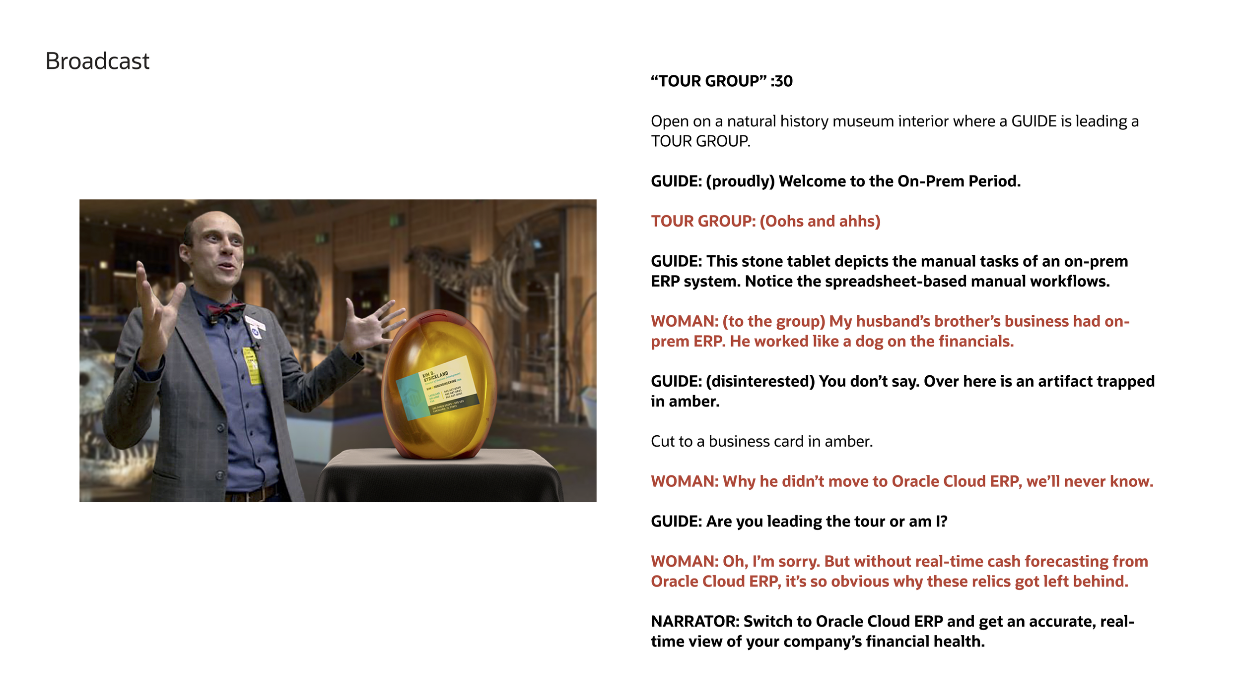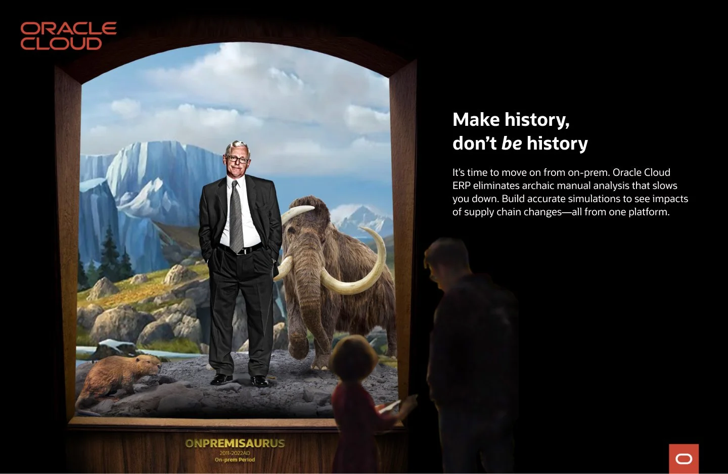I wanted the audience to recognize that Oracle Cloud ERP is vital to their business success and survival. I used hyperbole to demonstrate the benefit. The idea of a business stuck in prehistoric times conveyed the risk of staying with on-premise applications and generated urgency to act. Like a strong campaign idea should, it lent itself to an array of executions for print, radio, TV, social, digital, event display, and geurilla tacticts. We knew we were onto something—an idea that’s Relevant, Unexpected, and Like-able.